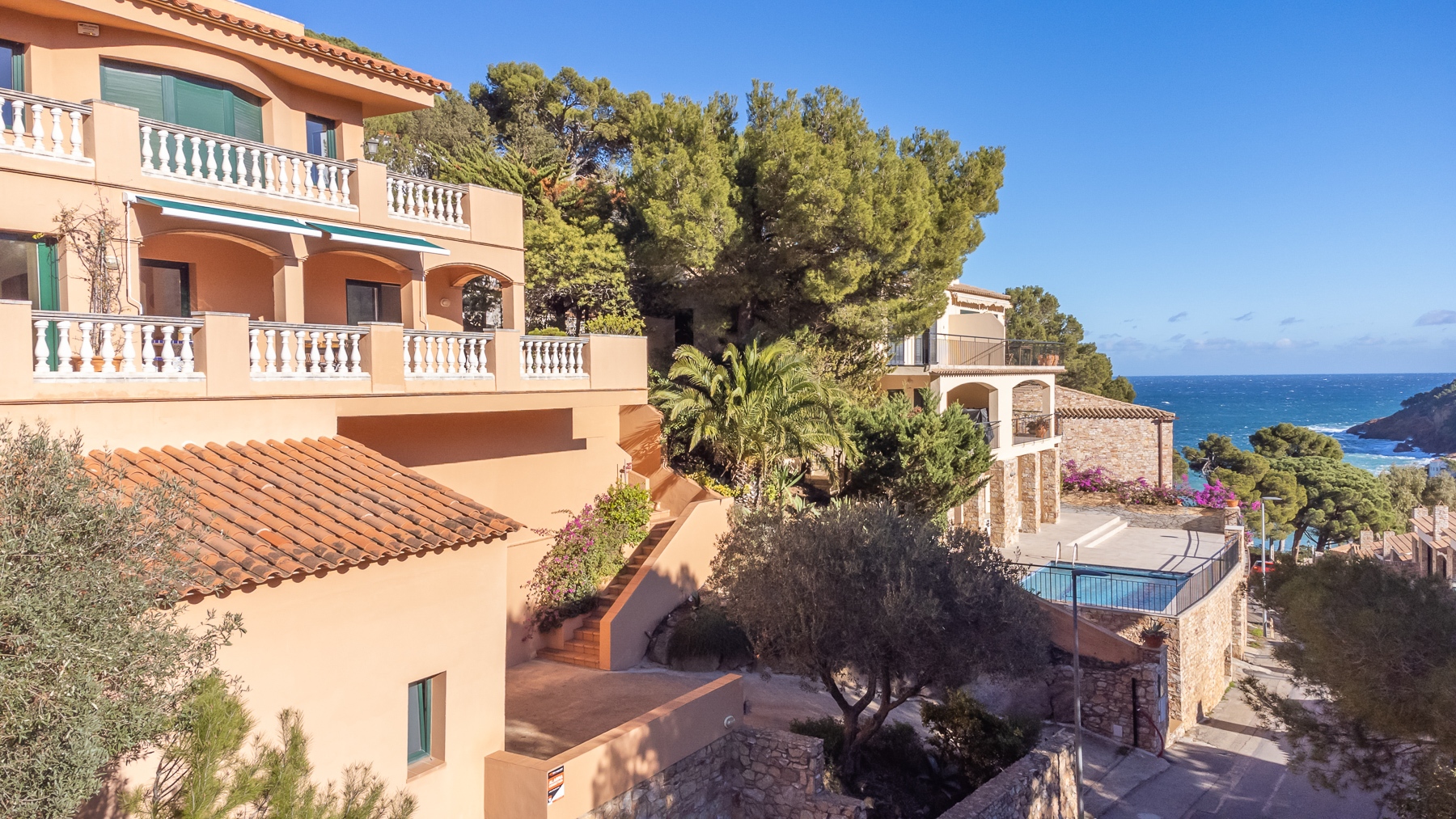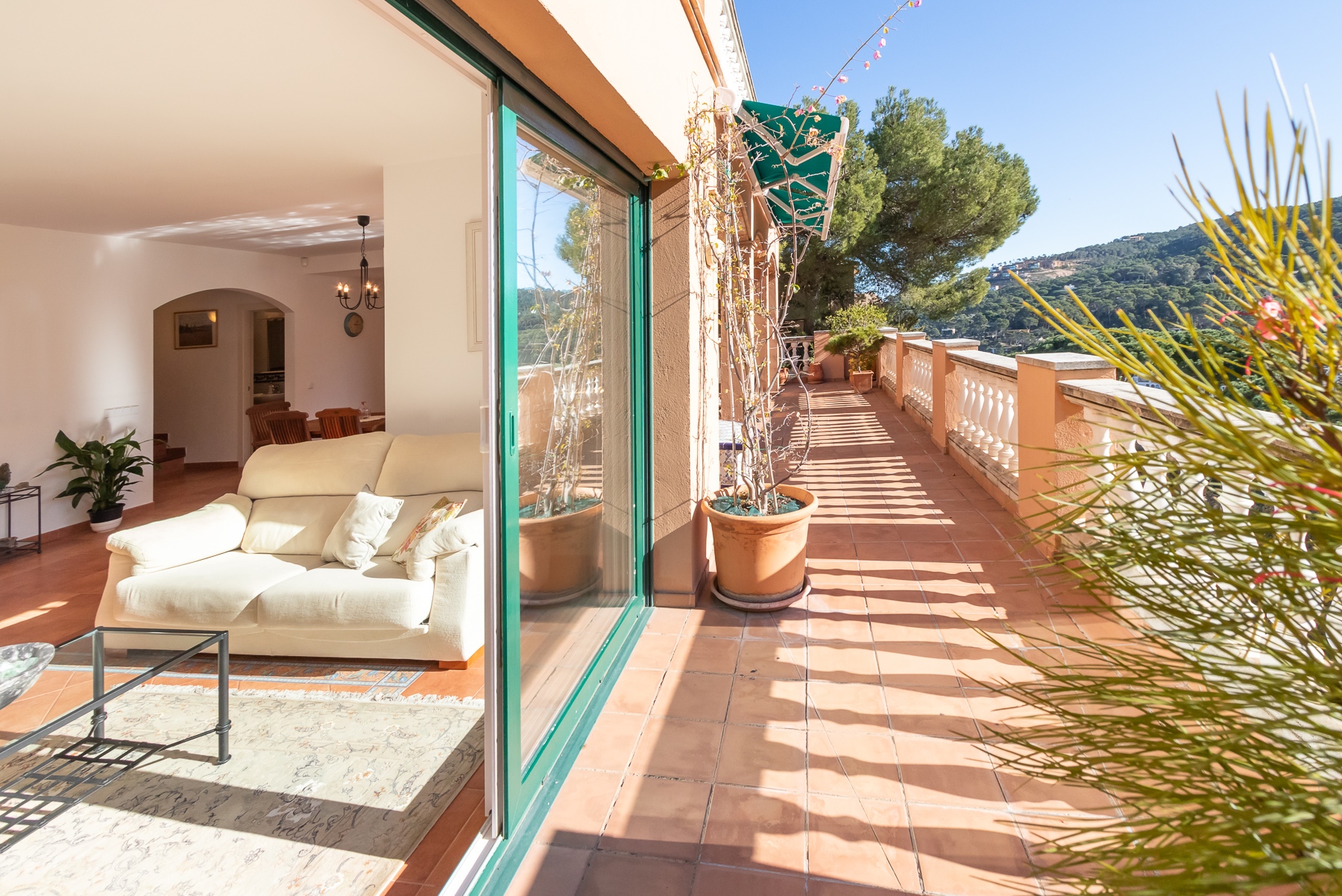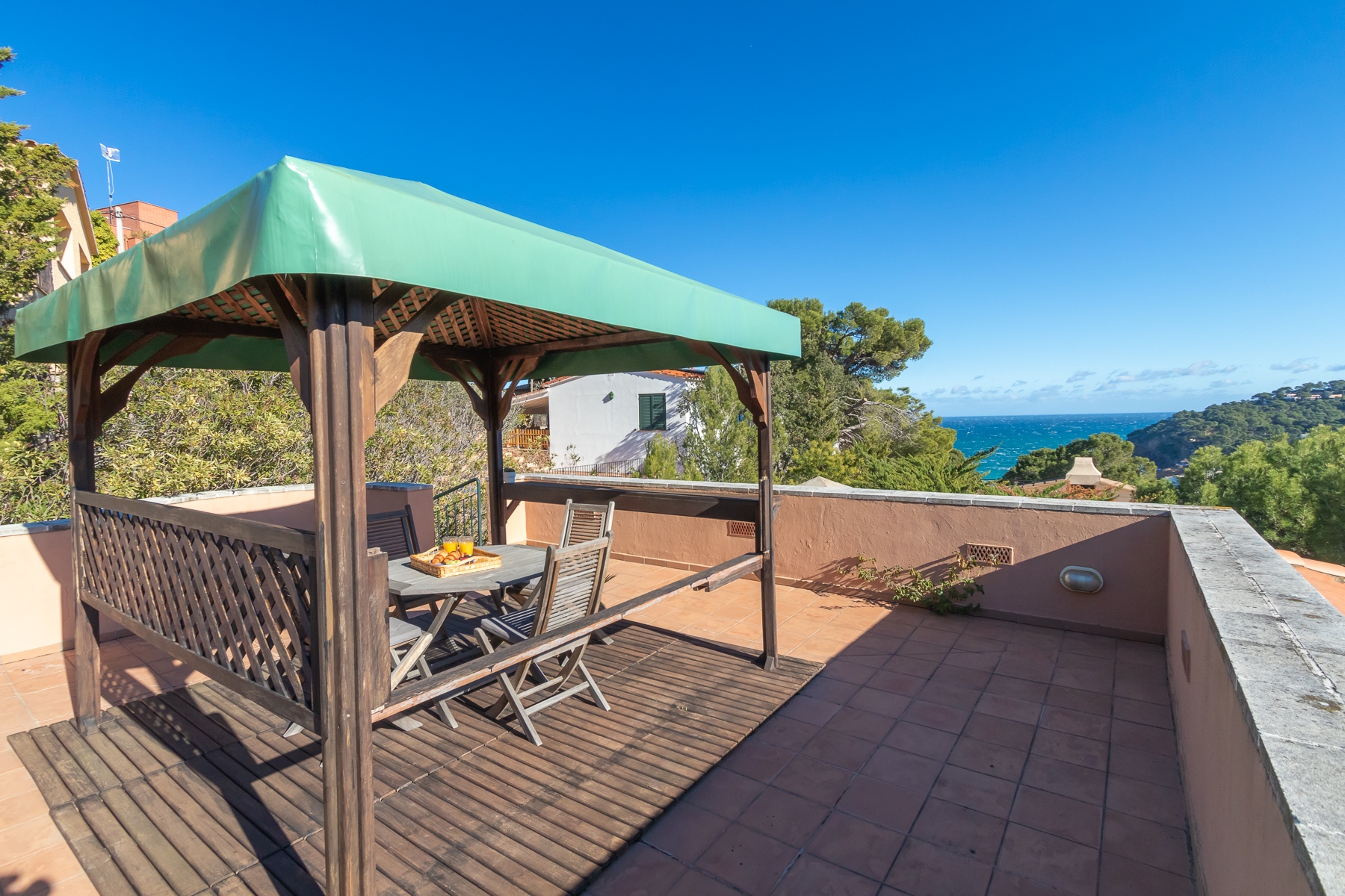 Por atrás de la piscina, se encuentran las escaleras de acceso a la fantástica terraza, donde podrán disfrutar de la tranquilidad e intimidad de esta propiedad, con una zona de comedor con magníficas vistas al mar y los alrededores, 360 grados.