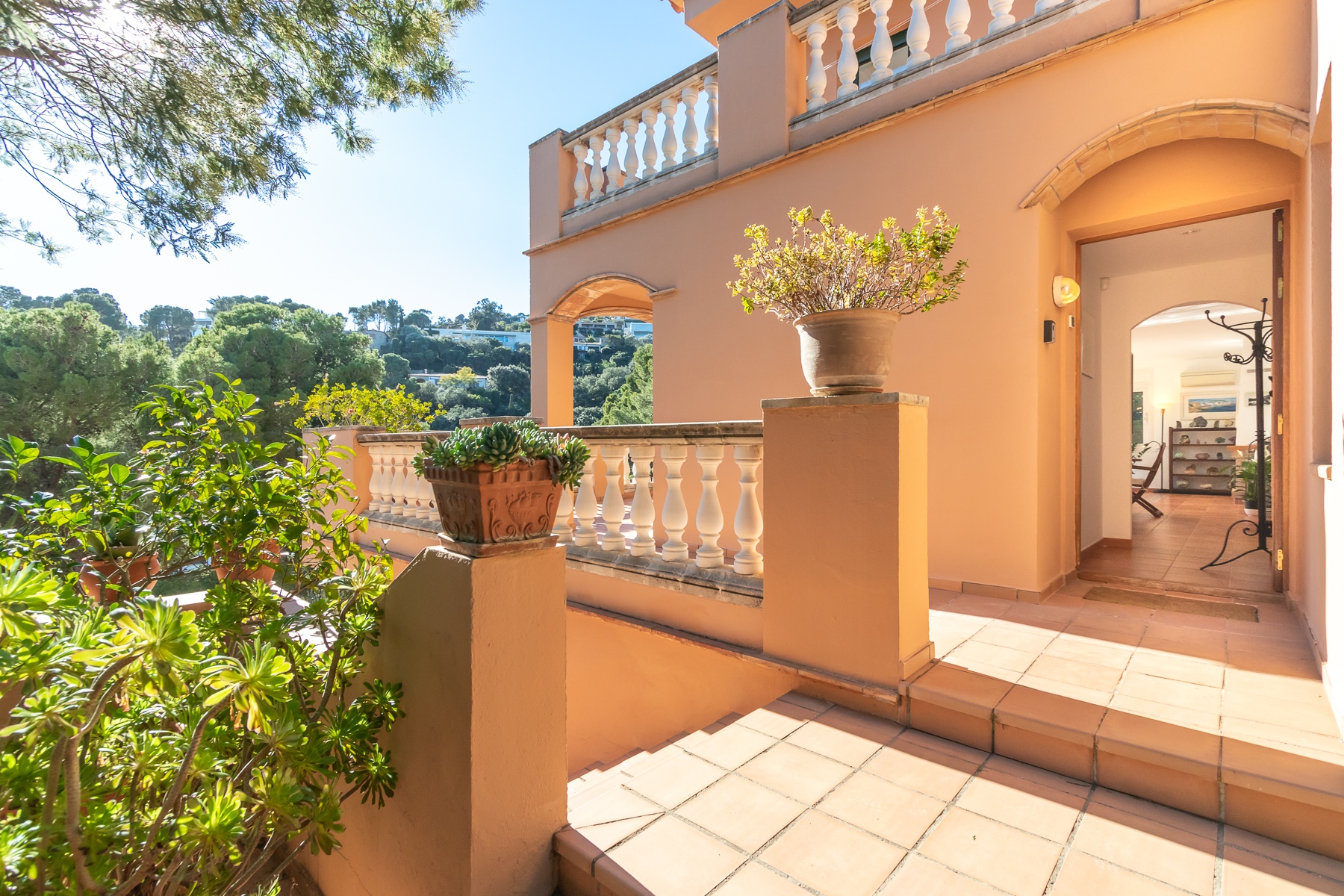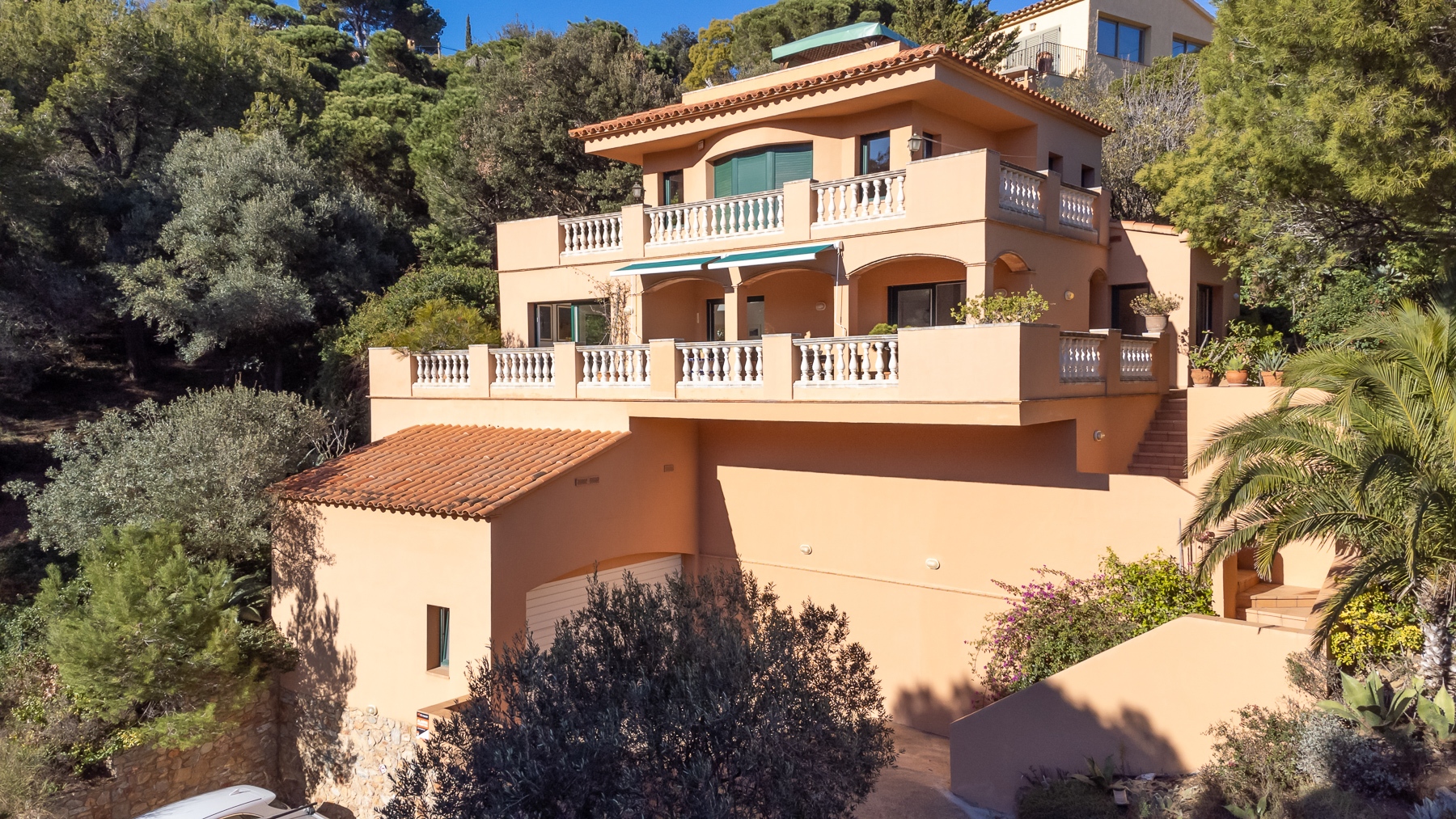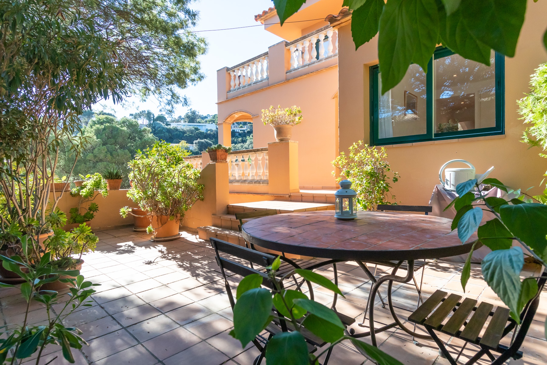 Por atrás de la piscina, se encuentran las escaleras de acceso a la fantástica terraza, donde podrán disfrutar de la tranquilidad e intimidad de esta propiedad, con una zona de comedor con magníficas vistas al mar y los alrededores, 360 grados.
